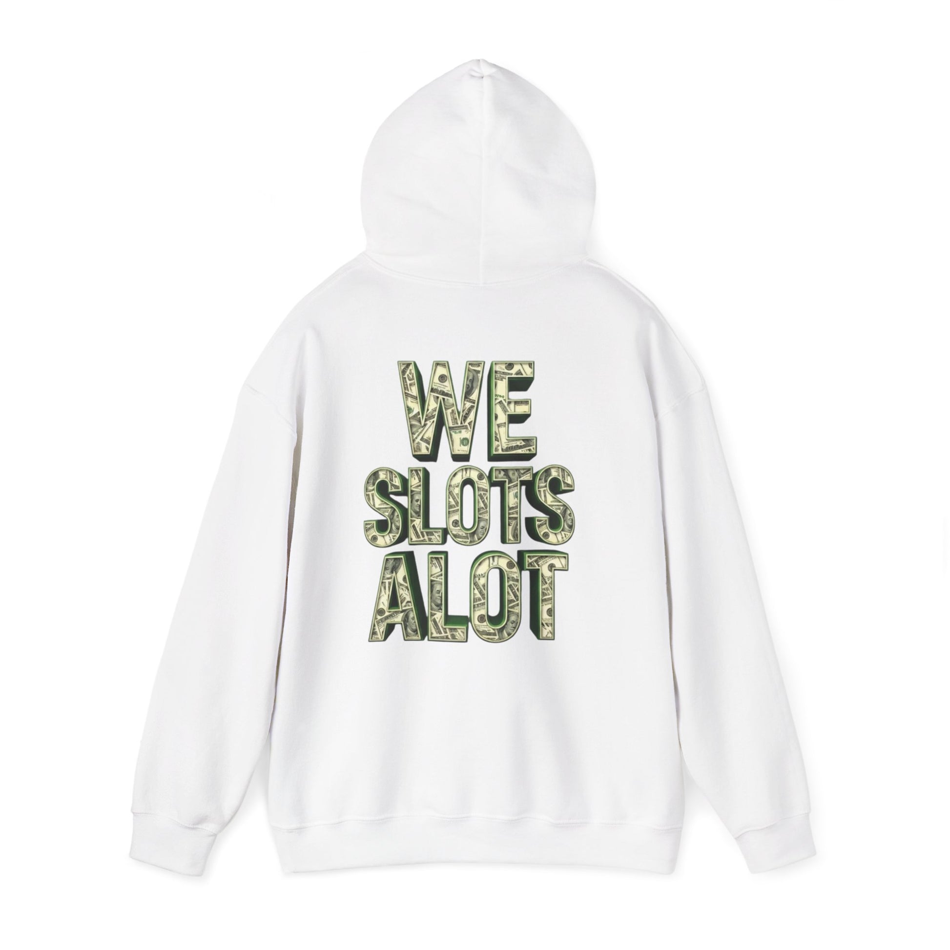 Turn it around and the back makes just as strong an impression. The bold "We Slots Alot" brand name fills the entire back panel in massive, stacked block lettering, an oversized statement that leaves no doubt about who you are and what crew you roll with. Front to back, this hoodie is a complete look. Every element on both sides is rendered in vivid, high-definition detail using professional printing techniques with crack-resistant, fade-resistant ink engineered to last.